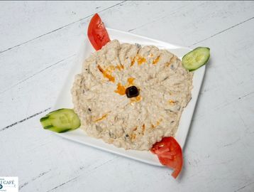 Mashed cooked eggplant mixed with yogurt, garlic and served with pita bread