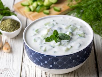 Yogurt, finely chopped cucumbers, garlic with herbs, spices