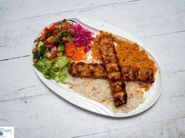 One skewer of Chicken and Lamb Shish served with rice and salad