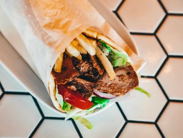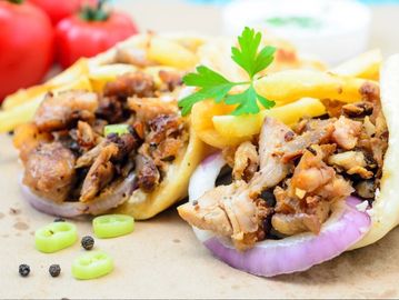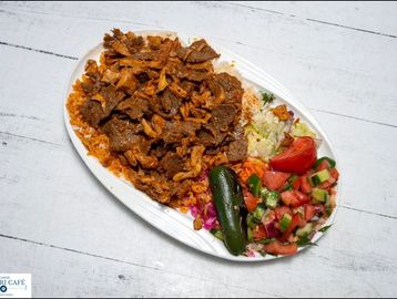 Mix of Chicken and Lamb Doner, tomatoes, pickles, onion with white /hot sauce