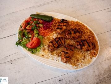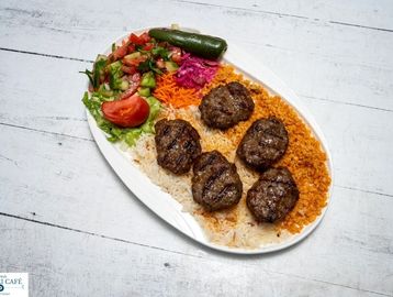 3 pieces of both Chicken Kofte and Lamb Kofte served with rice and salad