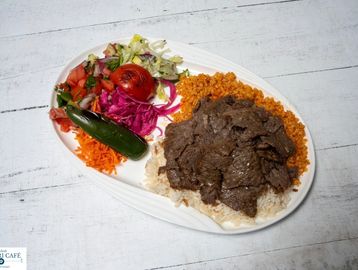 Thin slices of beef cooked on a rotisserie served with rice and salad