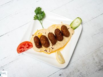Mashed chickpeas mixed with celery, parsley, onions, garlic, carrot, flour and served with hummus