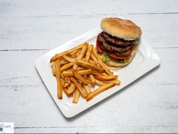 Homemade burger with lettuce, tomato, onions, pickles, ketchup/mayo/mustard and served with french fries