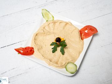 Mashed chickpeas flavored with garlic, lemon juice, cumun, tahini and served with pita bread