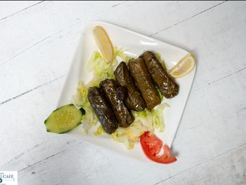 Fresh grape leaves stuffed with rice, pine nuts, raisins, fresh herbs, olive oil and served with white sauce