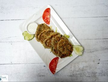 Vegetarian fritters made from zucchini, carrot, parsley, dill, flour, egg, olive oil and spices, served with white sauce