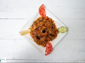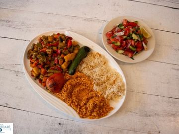 Green beans, peppers, zucchini, onions, eggplant, and seasoning served with rice and shepherd salad