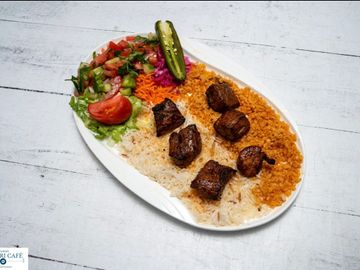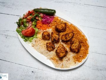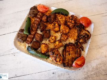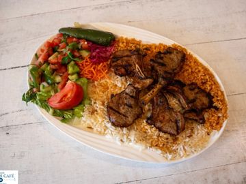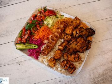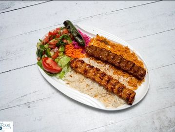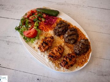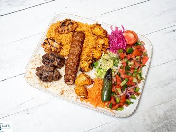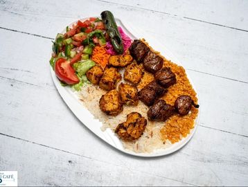 Adana Kebab (1 stick), Chicken Shish (1 stick), Lamb Kofte (2 pcs), Chicken Kofte (2 pcs), Chicken Chops (2 pcs), Lamb Shish (1 stick), served with rice, shepherd salad and homemade bread