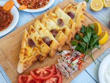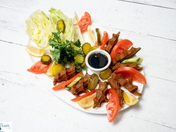 Hummus, Dolma, Baba Ghanoush, Ezme Salata, Sigara Borek, Falafel, Iclli Kofte, Soslu Patlican, Cig Kofte and Mucver. Served with homemade bread (Choose 4)
