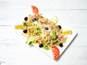 Green salad, lettuce, tomato, cucumber, peppers, red onion, olives, feta cheese, served with bread