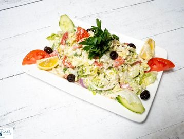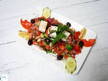 Tomatoes, feta cheese, green onion, green pepper, olives, cucumber, red onion, parsley in olive oil, vinegar and lemon juice served with homemade bread.