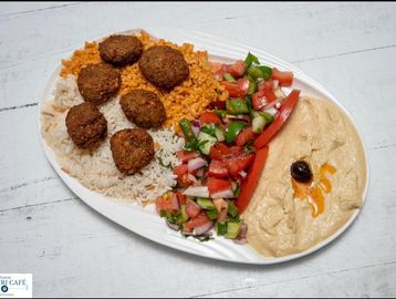 6 pieces of Falafel served with hummus, shepherd salad and rice