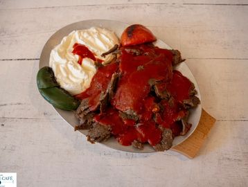 Slices of Doner (Gyro) mixed with tomato sauce over pita bread with yogurt and butter