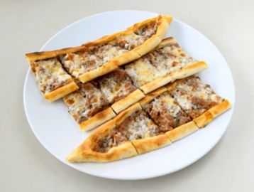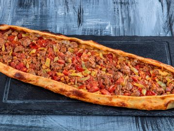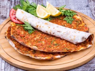 3 round, thin piece of dough topped with minced meat and minced vegetables and herbs including onions, tomatoes and parsley, then baked