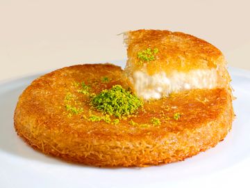 Homemade sweet pastry with cheese baked between two layers of crispy pastry threads and drizzled with sugar syrup.