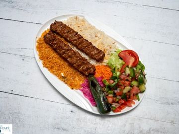 1 skewer of Chicken Adana and Lamb Adana served with rice and salad