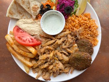 Choice of chicken with hummus, falafel, salad, french fries, rice, pita and white sauce.