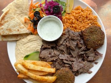 Choice of lamb with hummus, falafel, salad, french fries, rice, pita and white sauce