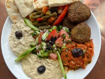 Falafel, veggie casserole, hummus, baba ghanoush, ezme, shepherd salad and pita