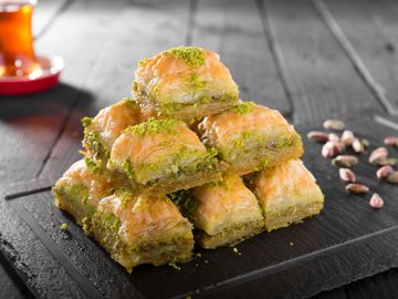 Baked pastry of phyllo dough with pistachio and drenched with syrup, served with 3-pieces