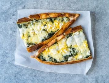 Baked pastry made from phyllo dough with feta/mozzarella cheese, butter, spinach, milk, corn oil and parsley