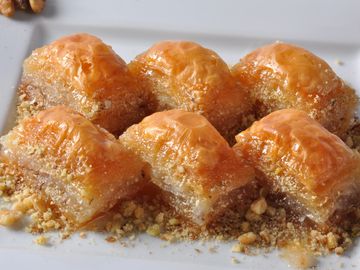 Baked pastry of phyllo dough with walnut and drenched with syrup, served with 3-pieces