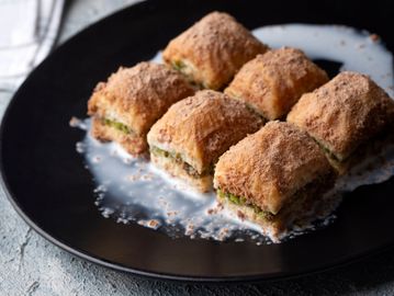 2 pieces of milky Baklava filled with pistachios or hazelnuts served cold